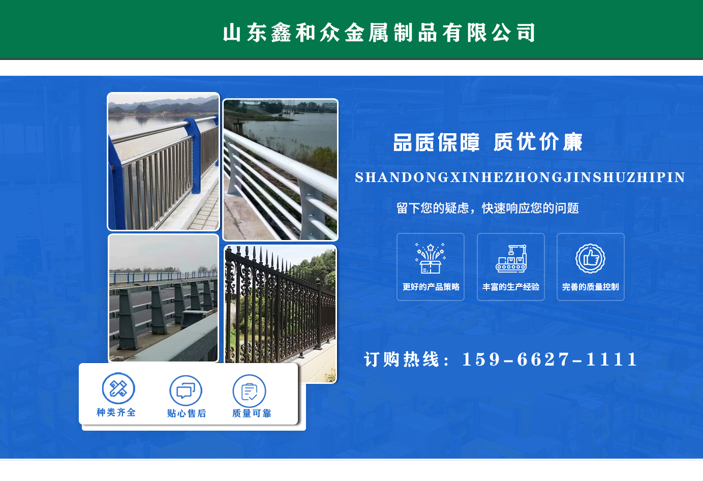 山東鑫和眾金屬制品有限公司主要產(chǎn)品有防撞護(hù)欄,橋梁護(hù)欄,道路護(hù)欄,河道護(hù)欄,不銹鋼護(hù)欄等護(hù)欄。提供設(shè)計(jì)方案,一站式定制,包您滿(mǎn)意價(jià)格優(yōu)惠,歡迎來(lái)電咨詢(xún)! 公司常年從事銷(xiāo)售護(hù)欄防撞護(hù)欄,橋梁護(hù)欄,道路護(hù)欄,河道護(hù)欄,不銹鋼護(hù)欄,橋梁鋼護(hù)欄,河道燈光護(hù)欄等。產(chǎn)品廣泛應(yīng)用于橋梁、河道、旅游景區(qū)、道路、公路、公園、小區(qū)、景觀、道路防撞等領(lǐng)域。 公司產(chǎn)品均采用優(yōu)質(zhì)不銹鋼材料,符合相關(guān)標(biāo)準(zhǔn)。各種型號(hào)不銹鋼復(fù)合管及護(hù)欄,質(zhì)量嚴(yán)格把控。產(chǎn)品強(qiáng)度高、耐腐蝕、焊接牢固、抗沖擊、性能好,防撞護(hù)欄結(jié)構(gòu)簡(jiǎn)單、美觀實(shí)用大方?! g迎前來(lái)訂購(gòu)!...